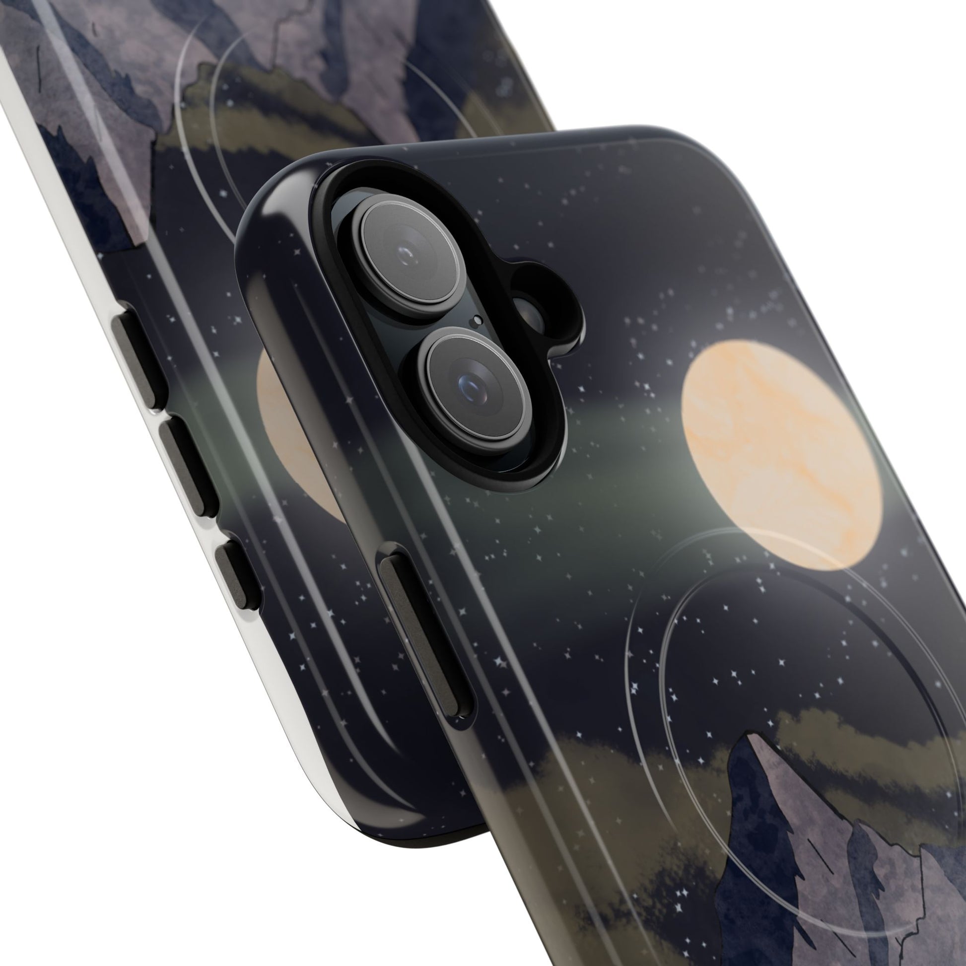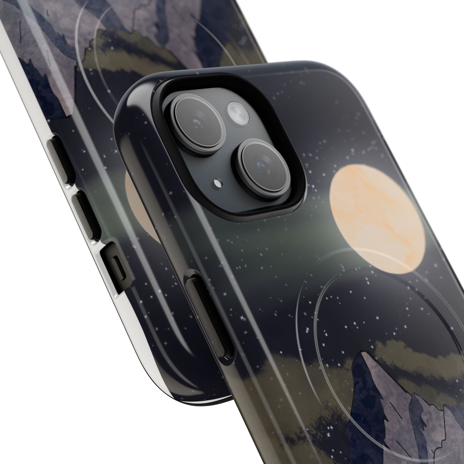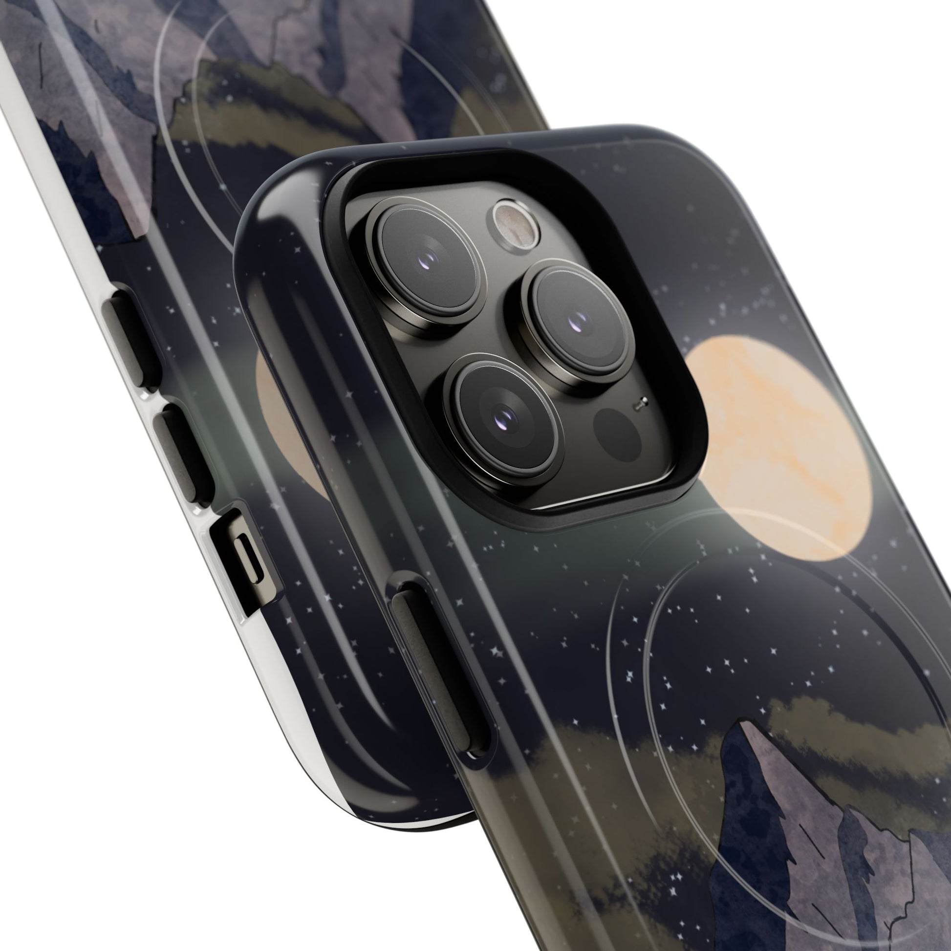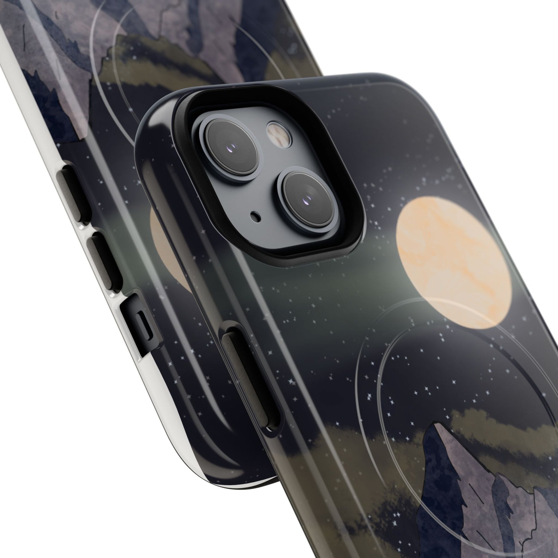 Eine robuste magnetische Handyhülle mit einem ruhigen Bergpanorama bei Nacht, zweilagigem Schutz und MagSafe®-Kompatibilität für sicheren und stilvollen Schutz im Alltag.