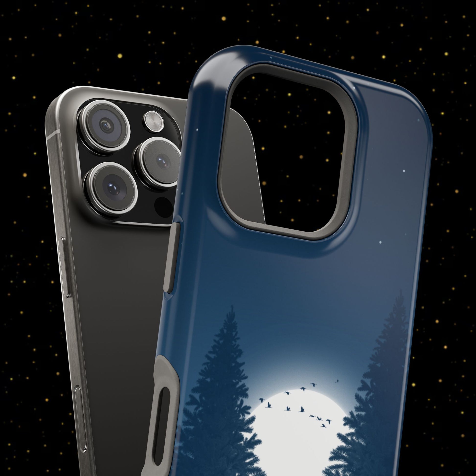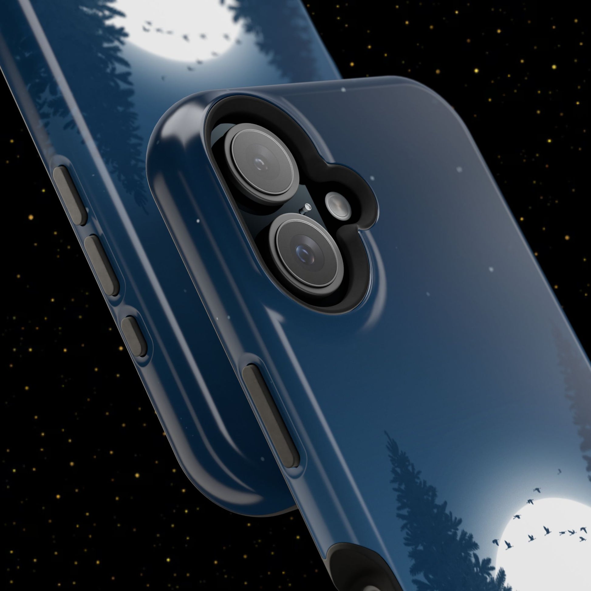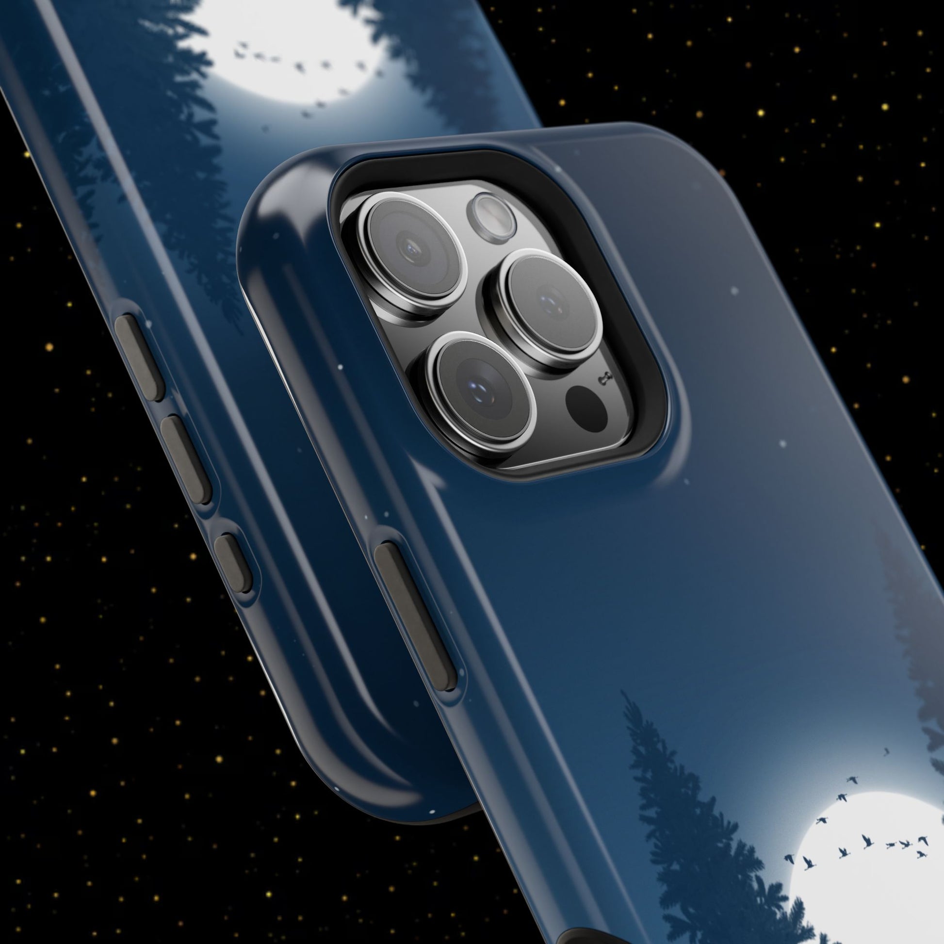 Diese schlanke, stoßfeste Handyhülle im Mondschein-Design mit tiefen Marineblautönen kombiniert zweilagigen Schutz mit MagSafe-Kompatibilität für sicheren Halt im Alltag. Erhältlich in matt oder glänzend, passend zu deinem Stil.